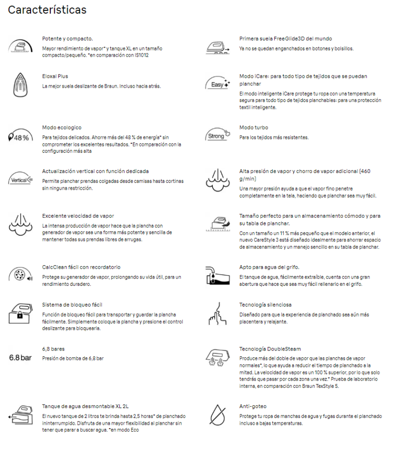 Más pequeña, más ligera y más potente que nunca. Diseñada para ahorrar espacio de almacenamiento y un manejo sencillo, la nueva CareStyle 3 es ahora un 11 % más pequeña que el modelo anterior. Pero a pesar de su tamaño compacto, cuenta con un nuevo depósito XL de 2 litros que te permite planchar hasta 2,5 horas* sin tener que parar a buscar agua. Y está repleta de funciones inteligentes que te permiten ahorrar tiempo. Ahorrarás un 50 % de tiempo** para lo que realmente importa gracias a la combinación única de la tecnología FreeGlide 3D y la tecnología DoubleSteam, que viene de serie en toda la gama CareStyle. Además, cuenta con el nuevo e innovador sistema Easy CalcClean, que solo tarda dos minutos en descalcificarse.