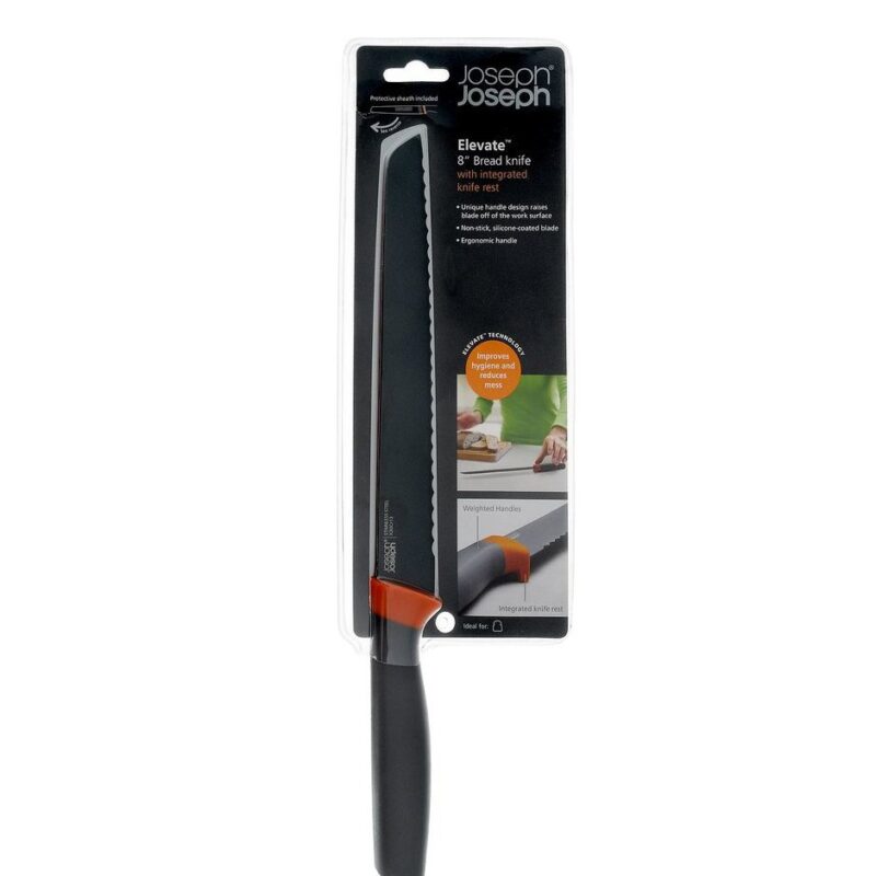 El cuchillo para pan dentado Elevate de 8 pulgadas tiene una hoja de acero japonesa recubierta de silicona antiadherente con un mango ergonómico. El cuchillo tiene un innovador mango con peso con un reposacabezas integrado, lo que garantiza que cuando se coloca el cuchillo hacia abajo, su hoja siempre se levante de la superficie de trabajo, lo que mejora la higiene y reduce el desorden. Los cuchillos para pan dentados pueden cortar pan blando sin aplastar ni aplastar las rebanadas. Cada cuchillo viene con su propia funda protectora de almacenamiento para evitar que los cuchillos se desafilen en el cajón y para proteger las manos. La hoja mide 8 pulgadas. Lavar a mano y secar.